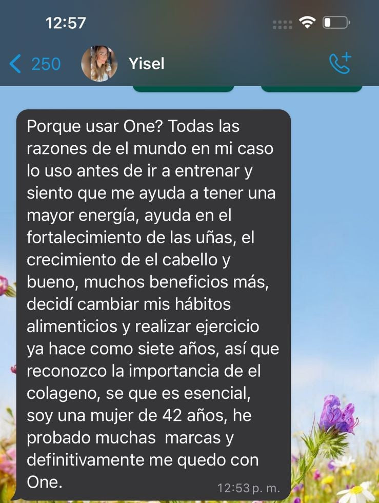 Porque usar One? Todas las razones de el mundo en mi caso lo uso antes de ir a entrenar y siento que me ayuda a tener una mayor energía, ayuda en el fortalecimiento de las uñas, el crecimiento de el cabello y bueno, muchos beneficios más, decidí cambiar mis hábitos alimenticios y realizar ejercicio ya hace como siete años, así que reconozco la importancia de el colageno, se que es esencial, soy una mujer de 42 años, he probado muchas marcas y definitivamente me quedo con