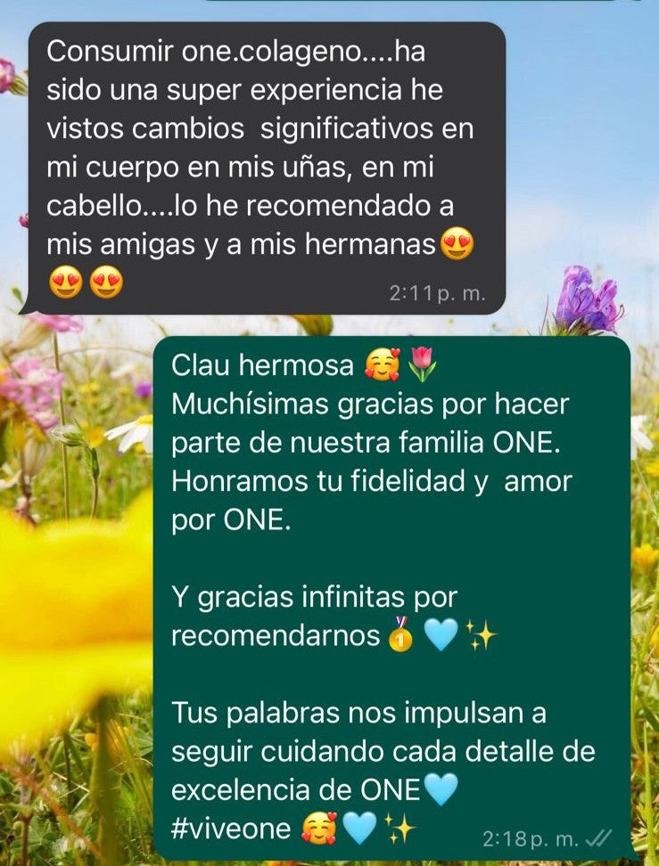 Consumir one.colageno....ha sido una super experiencia he vistos cambios significativos en mi cuerpo en mis uñas, en mi cabello....lo he recomendado a mis amigas y a mis hermanas
